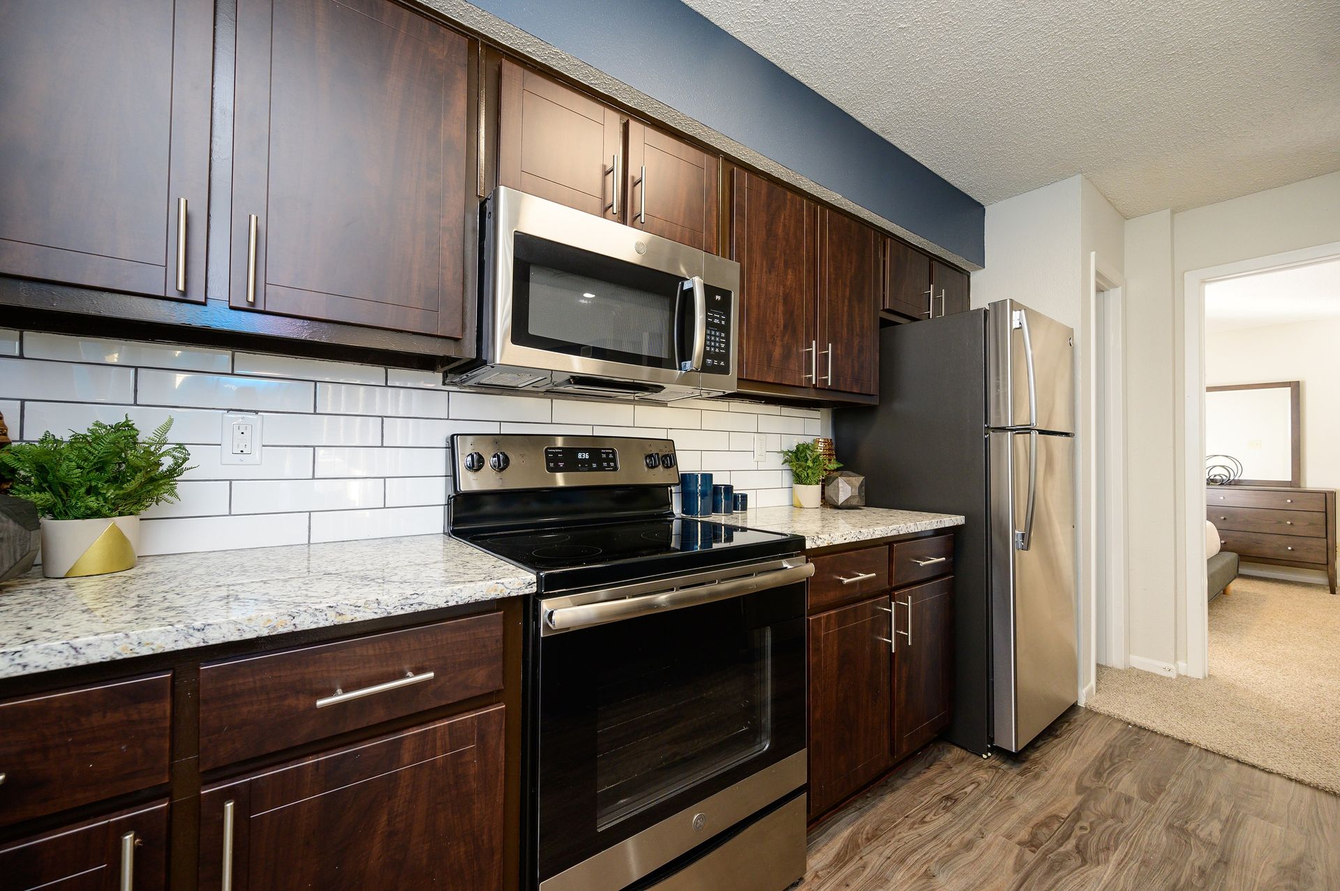 A fully equipped kitchen makes it easy to whip up a flavorful meal when you feel like dining in. Stainless-steel appliances add modern appeal to your space and custom cabinetry offers plenty of room for your cooking essentials